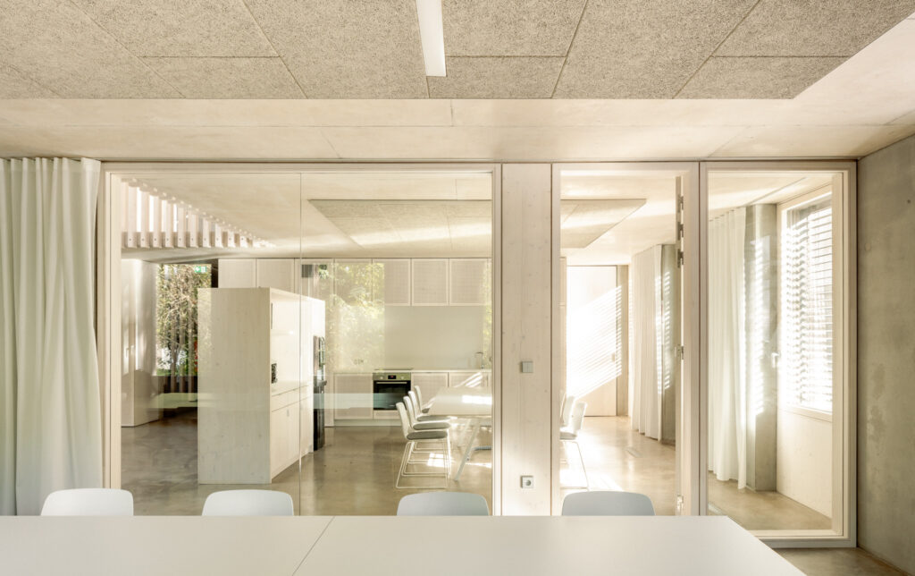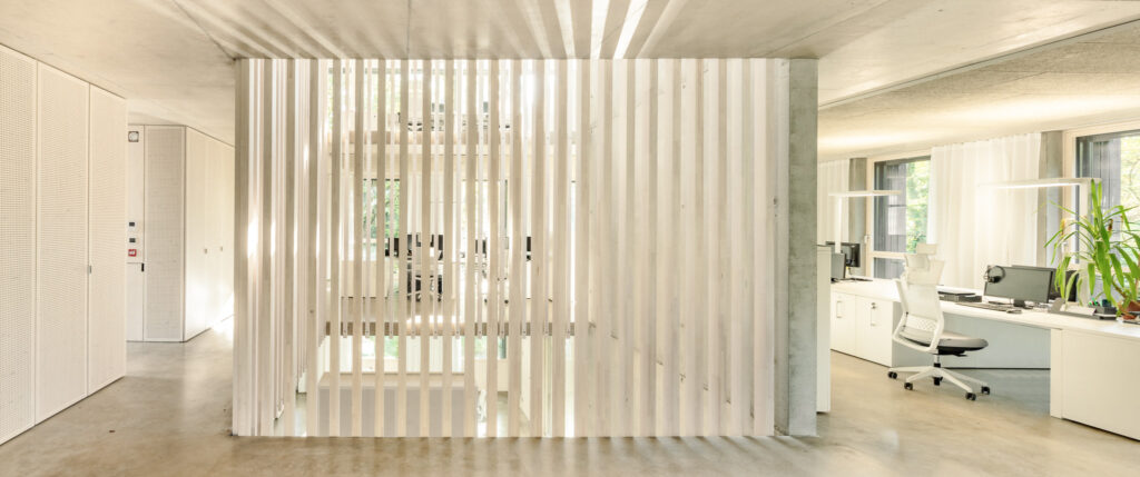 « Sur la rive nord de l’Ill, les anciens locaux de torréfaction des cafés Semos ont été transformés pour y installer les bureaux de Solares Bauen, bureau d’études spécialisé dans la qualité environnementale. La grande toiture pénalisant le volume habitable, un couronnement parfaitement équarri renouvelle avantageusement l’image du bâtiment. Le projet, compact, développe trois niveaux de planchers qui ceinturent un vide central. Cet espace diffuse au cœur des bureaux une lumière tamisée par des claustras de bois. Les planchers en béton favorisent l’inertie du lieu, tandis que 40 cm de ouate de cellulose en façades et 24 cm de PU en toiture garantissent la labellisation Passivhaus. Sur le toit-terrasse, 90 m2 de panneaux photovoltaïques devraient assurer la production de 18 kWc, soit 80% des besoins énergétiques annuels de l’entreprise. Le surplus de production électrique alimente une borne de rechargement de véhicules. La pompe à chaleur ne fonctionne qu’entre novembre et février, alors qu’un rafraîchissement d’été est obtenu par forage de la nappe phréatique. Le renouvellement d’air est assuré par le soufflage à basse vitesse, grâce à deux gaines périphériques. L’une est en infrastructure et agit comme un caniveau chauffant. L’autre est en allège du R+2, cumulant des diffuseurs vers le haut mais aussi vers le niveau inférieur. » extrait de la revue AMC n°298